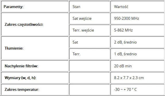 Wejście satelitarne przesyła napięcie DC, 22 kHz i komendy DiSEqC.