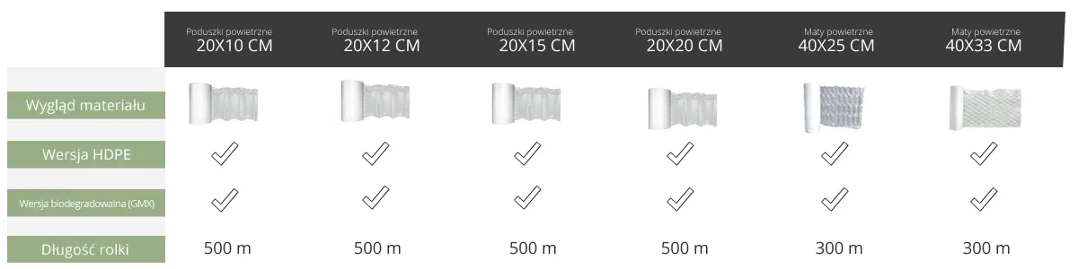 W naszej ofercie znajdują się maty oraz poduszki powietrzne w różnych rozmiarach. Każdy z materiałów występuje w dwóch wariantach: HDPE oraz GMX (surowiec biodegradowalny).