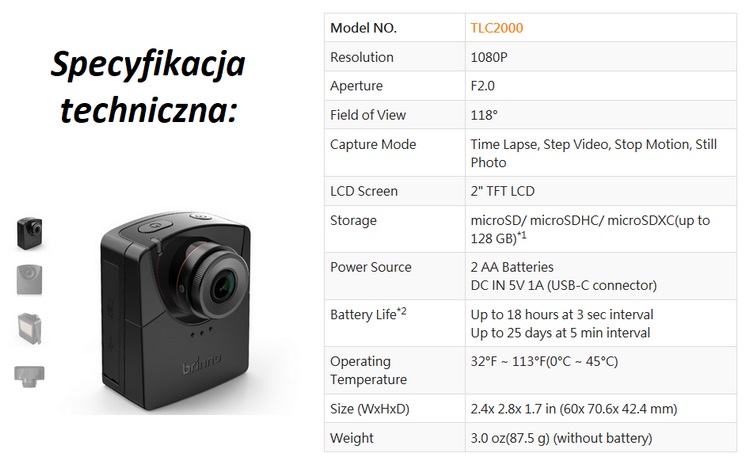 WYMIENNE OBIEKTYWY W modelu TLC2000 można wymienić obiektyw na dedykowany ze złączem CS-Mount. W naszej ofercie znaleźć można model Brinno BCS24-70.