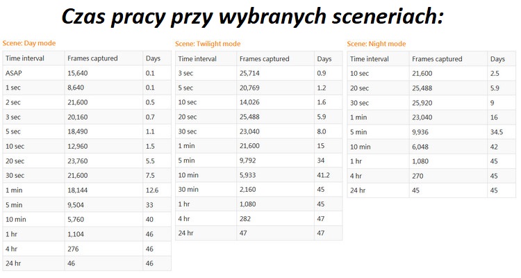 BARDZO DŁUGA PRACA NA JEDNYM KOMPLECIE BATERII Kamera TLC2000 jest zasilana z tylko dwóch baterii AA (typowy paluszek). Żywotność osiągana podczas testów jest wręcz niesamowita, nawet 47 dni pracy bez konieczności wymiany baterii na świeże.