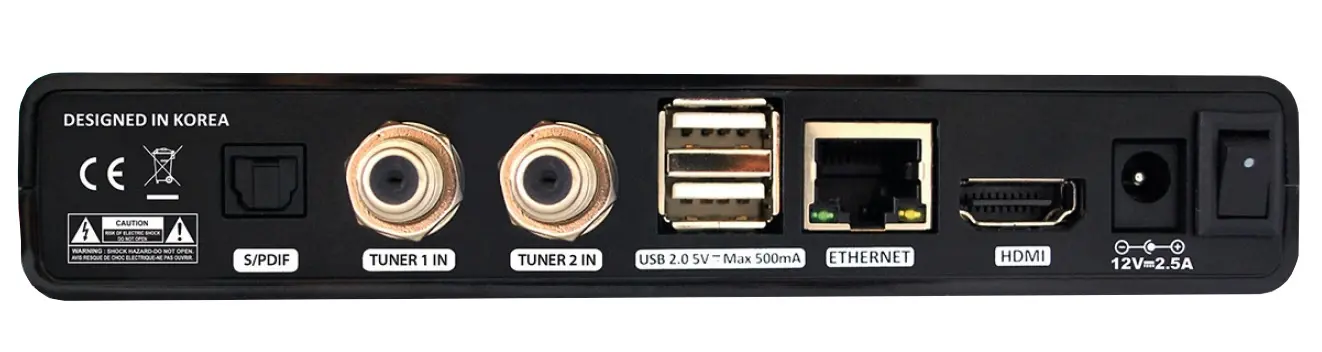Procesor: BROADCOM 1500MHZ 7K DMIPS System operacyjny: LINUX OS RAM: 1024MB DDR3 ROM: 4096MB NANO FLASH Czytnik kart: TAK Złącze Ethernet: TAK Wyświetlacz: DIODA LED HDMI: TAK Optyczne wyjście audio: TAK Obsługa DiSEqC: 1.3 USALS USB: 2x USB 2.0 Wymiary: 155x30x105 (mm)