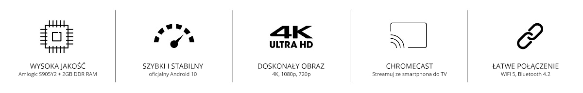 Kluczowe cechy - Najpotężniejszy streamer / odtwarzacz multimedialny 4K w kompaktowej konstrukcji - Oficjalny system Android 10 - Rozdzielczość 4K UHD przy 60 klatkach na sekundę - Potężny procesor QUAD Amlogic S905Y2 - 2 GB pamięci RAM DDR - HDMI 2.1 - Dolby Audio - WiFi 5 - Bluetooth 4.2