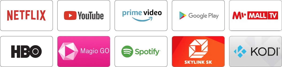 Google Assistant, YouTube, Netflix, Google Play Store, Prime Video, wbudowany Chromecast, obsługa najczęściej używanych aplikacji, takich jak KODI, HBO GO, Antik TV, Magio GO, Skylink i inne.