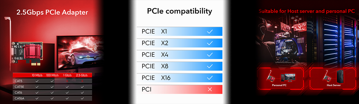 Karta sieciowa montowana jest przez PCI-E dzięki czemu nadaje się zarówno do stacji CP jak i serwerów. Jest kompatybilna z systemami Windows, Windows Server 2003, 2008, 2012, 2016 32/64-bit, Linux, MAC OS oraz DOS. Karta Cudy PE25 jest również kompatybilna z Jumbo Farme.