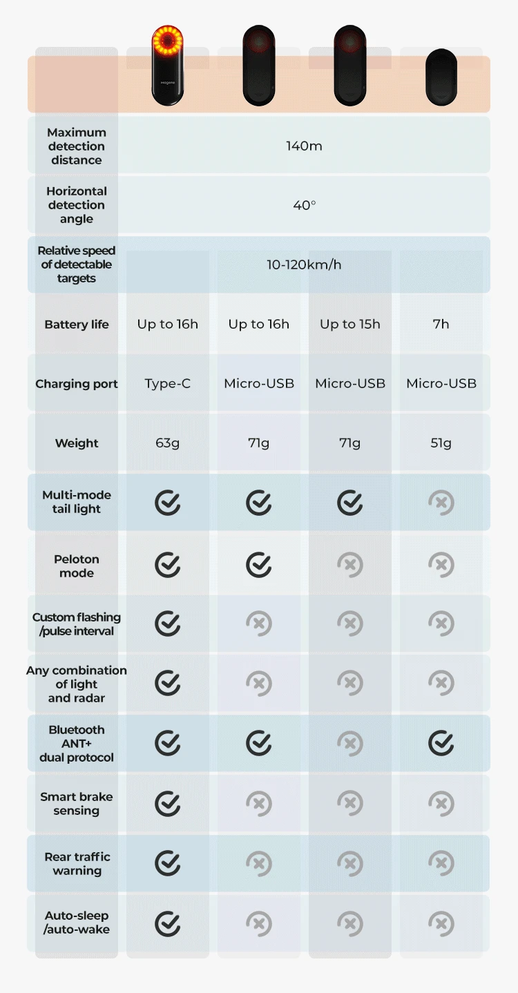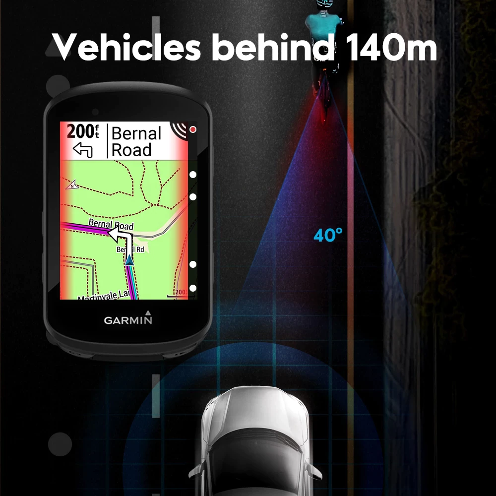 Lampka rowerowa posiada detekcję samochodów do 140m za rowerem. Kąt widzenia widzenia z poziomie wynosi 40 stopni. W momencie wykrycia samochodu informacja zostaje wysłana protokołem ANT+ do komputera rowerowego. Na ekranie pojawi się ostrzeżenie oraz kropki pokazujące odległość pojazdów od rowerzysty.