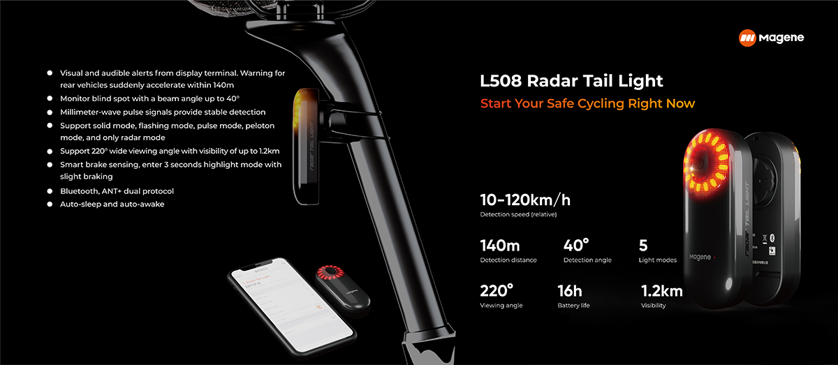 Odpowiednie oświetlenie rowerowe to podstawa bezpiecznego przemieszczania się po drogach. Zwykle takie urządzenia sprawiają, że rowerzysta jest bardziej widoczny na drodze. Jednak model Magene L508 posiada dodatkową funkcję- wbudowany w lampkę radar pozwala rowerzyście "zobaczyć", czy znajduje się za nim jakiś samochód. Informacje mogą być przekazywane do jednego z wielu kompatybilnych liczników za pośrednictwem protokołów ANT+ i Bluetooth. Radar działa na odległość 140m, co pozwala przygotować się na wyprzedzanie samochodu. Dodatkowo lampka jest wodoszczelna i posiada kilka trybów pracy.