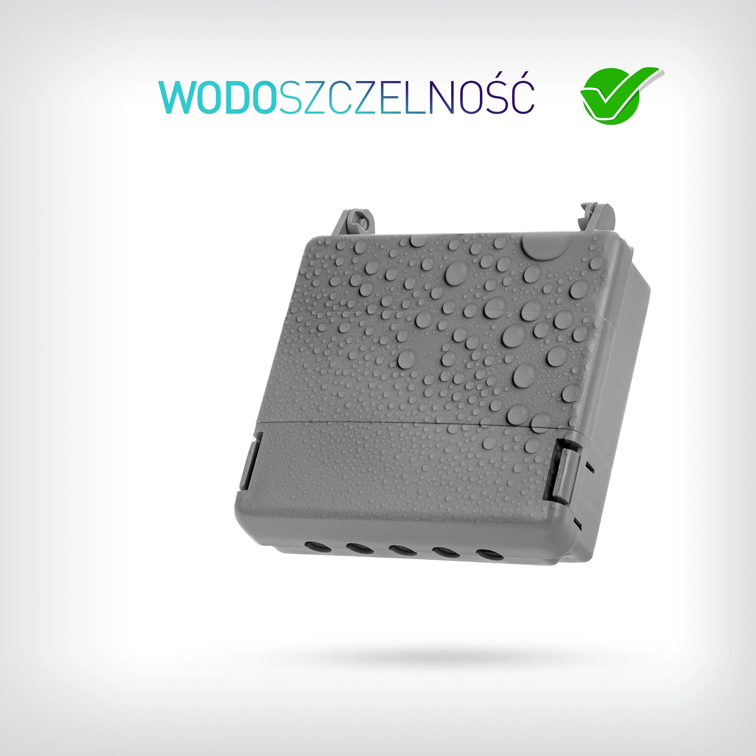Solidna obudowa wykonana z odpornego na warunki atmosferyczne plastiku. Zapewnia ona długotrwałą pracę nawet w najtrudniejszych warunkach pogodowych. Odporny na słońce i wodę (IP53). Większa izolacja między wejściami i wyjściami. Złącza typu F.