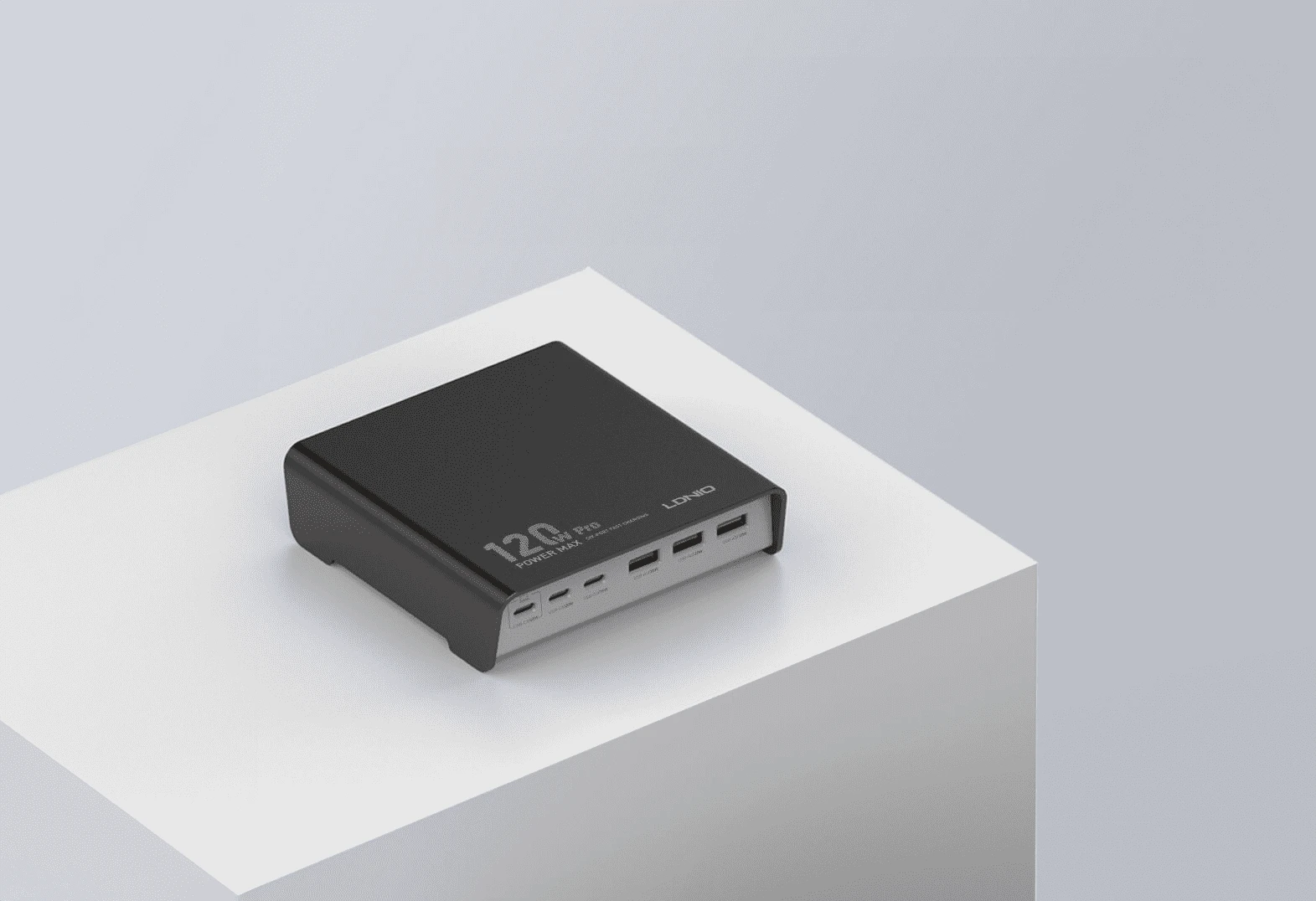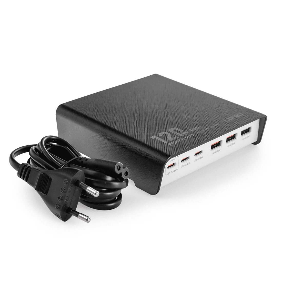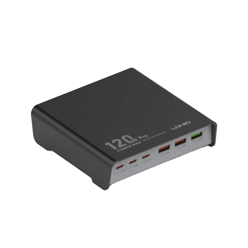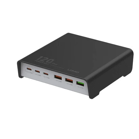 Stacja ładująca LDNIO Q605 została wyposażona w 6 portów USB. Są to 3 porty USB-C i 3 porty USB-A. Dzięki temu ładowarka jest kompatybilna nie tylko z większością modeli telefonów, ale również np. tabletów. Co więcej, stacja ładująca zapewnia wystarczająco silną moc, by móc nią ładować również laptopa.