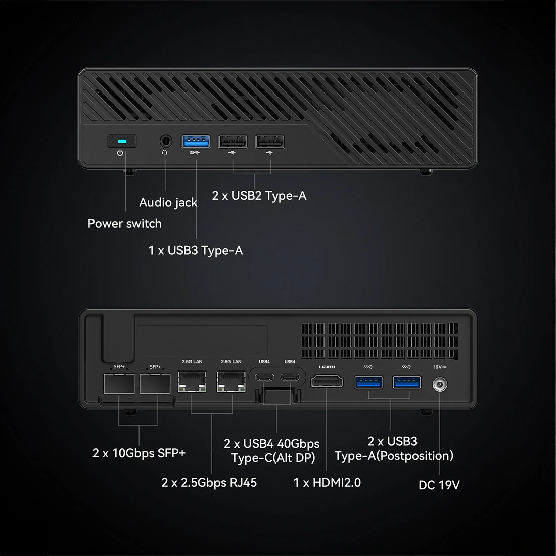 Komputer Minisforum MS01 mimo małych wymiarów jest urządzeniem bardzo uniwersalnym. Wszystko to z uwagi na mnogość różnorakich portów znajdujących się zarówno z przodu, jak i tyłu urządzenia: