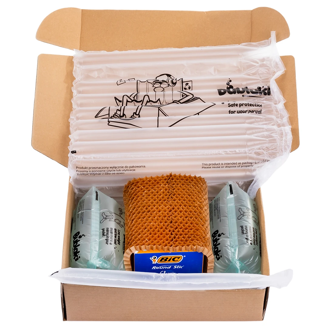 - Wypełnia puste przestrzenie – zapobiega przemieszczaniu się towarów w paczce.