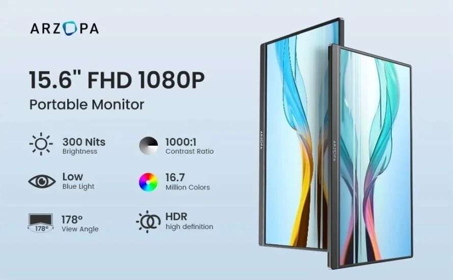 Monitor ARZOPA S1 Table oferuje wyjątkową jakość obrazu dzięki 15,6-calowemu ekranowi Full HD (1920 x 1080 px) oraz matrycy IPS. Szerokie kąty widzenia wynoszące 178° zapewniają pełną czytelność i dokładność kolorów niezależnie od kąta patrzenia. Dzięki technologii HDR oraz szerokiemu pokryciu przestrzeni kolorów sRGB obraz jest żywy, z doskonałym odwzorowaniem detali. Wysoki współczynnik kontrastu 1000:1 oraz jasność na poziomie 300 cd/m² gwarantują głębokie czernie i jasne biele, co sprawia, że monitor idealnie nadaje się do pracy z multimediami i rozrywki.